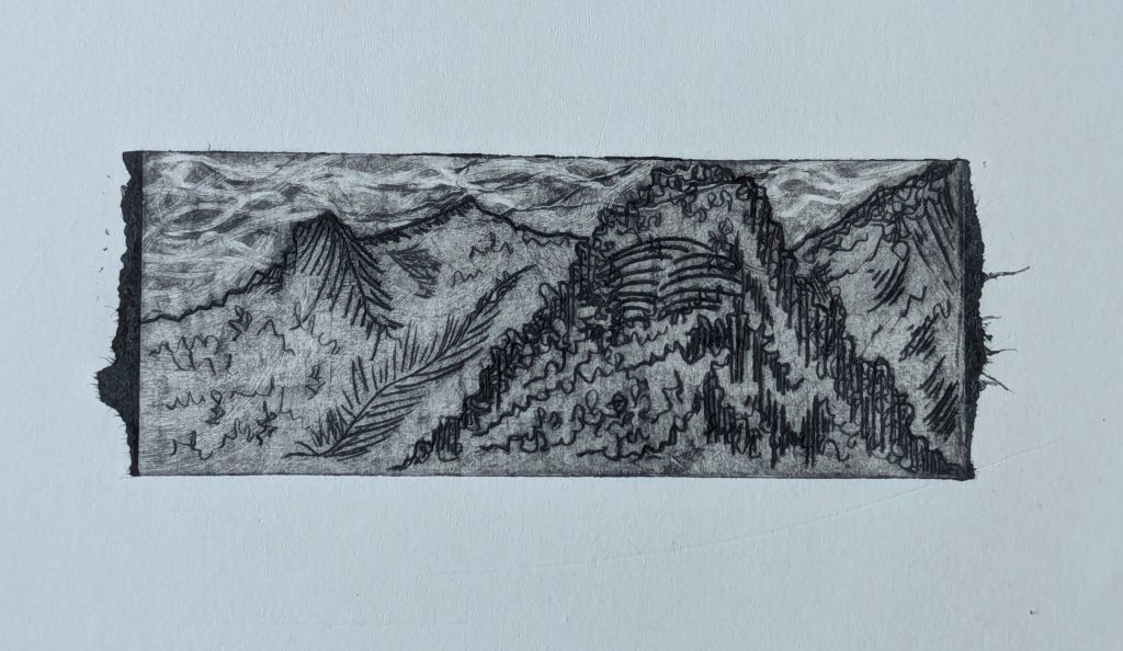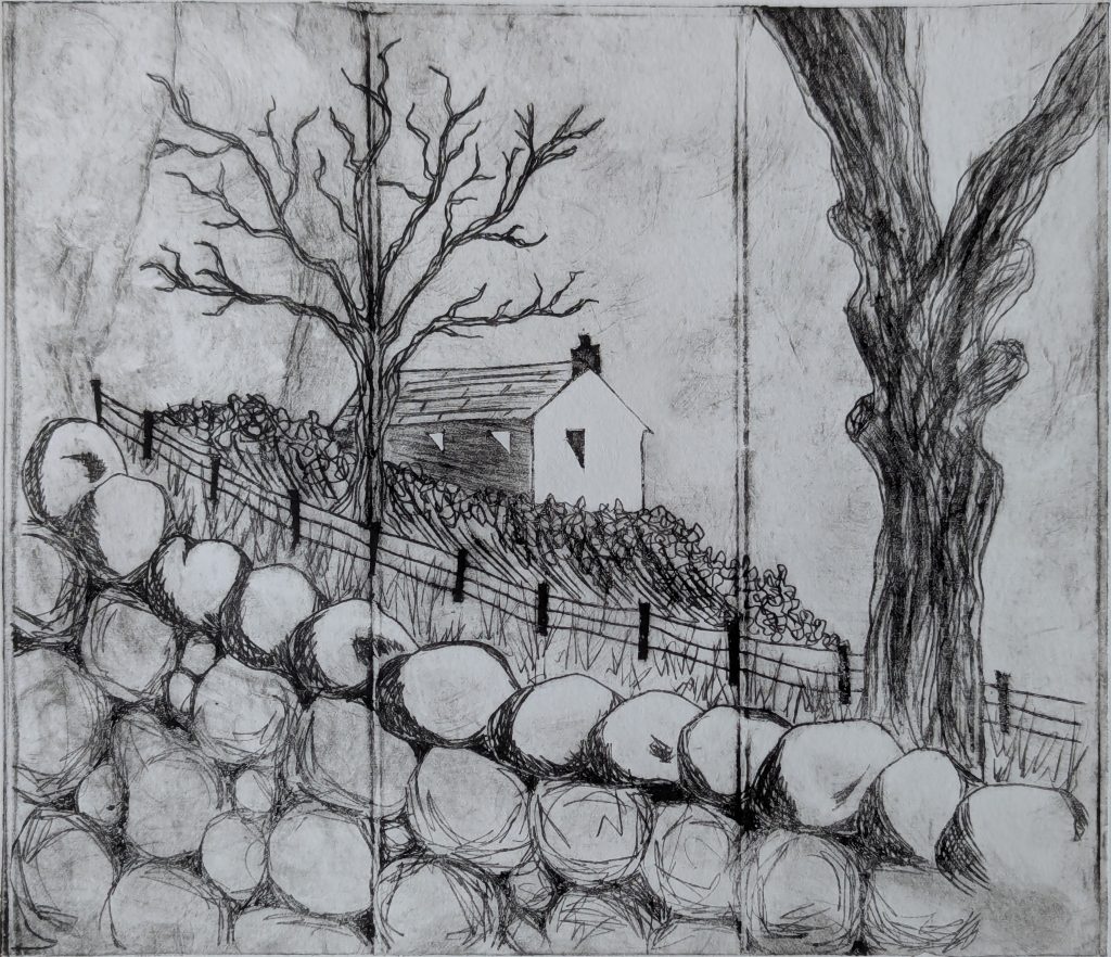 I create drypoint prints on acetate, metal and tetrapak, creating prints with a more of a sketch-like quality than in my block prints. I love the fine lines that can be achieved using the etching needles, balancing soft and sharp marks. I print either by hand-burnishing or using my converted pasta machine as an impromptu mini printing press!